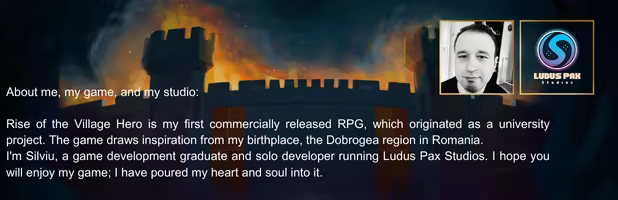Rise of the Village Hero is a lighthearted indie RPG set in the charming Kingdom of Dobroja. Play as Guy, a hunter who returns home to find his village, Warlington, under attack by orcs and goblins. Fight to protect your home, uncover the cause of the chaos, and restore peace by exploring diverse lands, interacting with factions, and completing quests. Discover treasures, brave dungeons, and become the hero Dobroja needs!