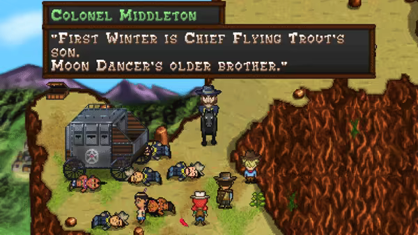 The story of “The Hangman’s Ballad” is unlocked post-game (after the end credit sequence). Cross the bridge in Kickstart Creek and our heroes will be asked to investigate a Chepakwik Indian raid on a wagon train at Crazy Bone Pass. Moon Dancer is determined to get to the bottom of this unwarranted assault, but when she finds that her own brother, First Winter, is behind the attack, she finds herself torn between the desire to defend her family while maintaining the peace.