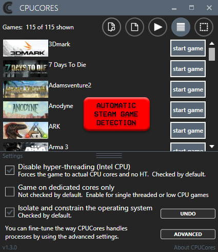 CPUCores automatically detects all of your Steam games. It also automatically integrates with Steam's ability to launch a game. You simply have to run CPUCores from within Steam, select the Steam game you wish to run optimally, then click the "START GAME" button within CPUCores. That's it!