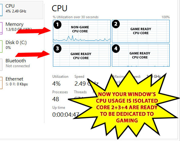 + When I ran it my Windows went to CORE 1 and my games went to CORE 2 + 3 + 4 (plus 1 if I enabled it)