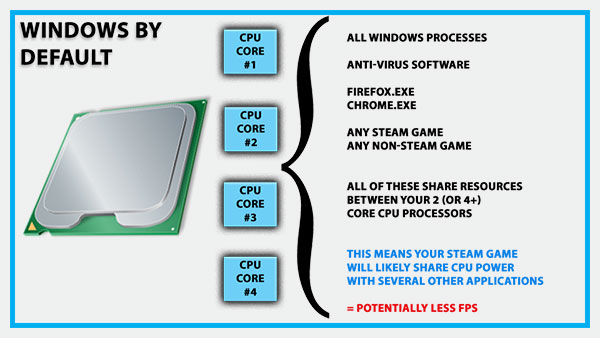 Your OS works to balance CPU energy consumption, power efficiency, and heat generation, with the end result being that a default Windows OS will often balance CPU consumption across all your cpu core processors, little by little. For example, if you look at your Windows Task Manager right now, you will likely see CPU usage between 2-20% across all of your processor cores. This is great for keeping all your cpu cores relatively cool as well as be more efficient with regards to energy consumption. However, this is at the cost of CPU POWER when gaming!