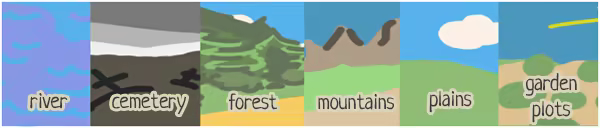 The first is the wilderness. When a player is in the wilderness, they have a choice on each turn between staying to activate some event card and going further. There are 27 event cards, of which 3 are unique to each type of location. The wilderness location has the following land types.