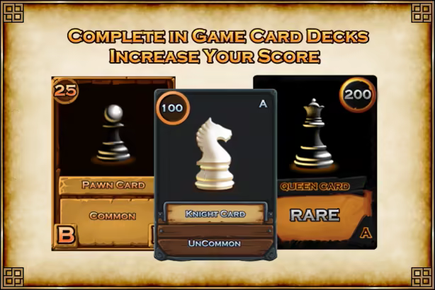 We have a unique in game card collection system where you earn booster packs to unlock in game cards as you win matches. You collect the cards to complete decks that help to increase your score. Even if you do not win, you still earn a basic booster pack that drop fewer cards. As you advance to a "tournament" club, you can earn rare cards for higher points earned when you play other tournament players.