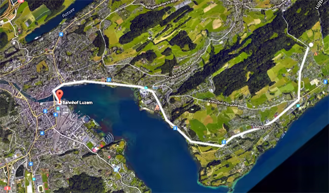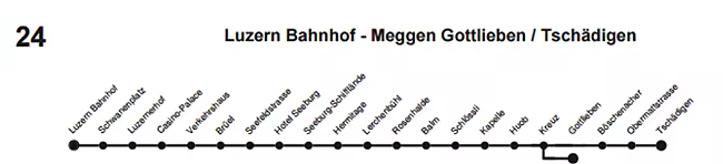 Line 24 leads from the Lucerne main railway station across the lake bridge towards the traffic building to Meggen. At the crossing of the lake, passengers can admire the world-famous "Kapellbrücke" with its striking tower, while some original cargo ships drive tourists across the lake.