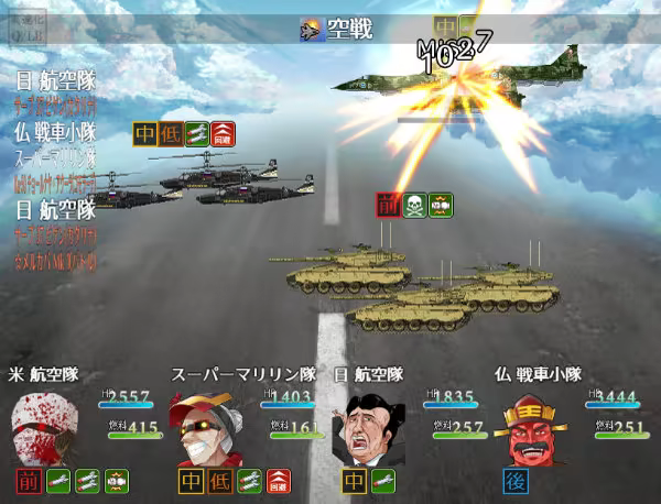 速度や燃料(航続距離)が低い兵器が混じっていると、部隊全体の足を引っ張るので気をつけよう。上の画像のような組み合わせだと、人目は引いても、戦力にはならないぞ。
