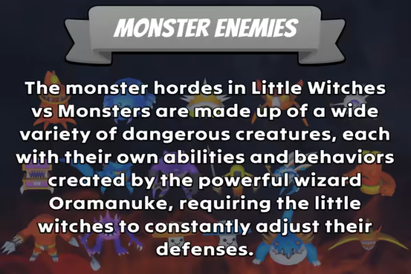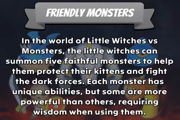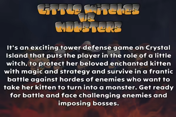 Get ready for battle in "Little Witches vs Monsters"!Defend your enchanted kitten with magic and strategy as you face hordes of enemies who want to take your kitten to turn into a monster, in this tower defense game on the Crystal Island.