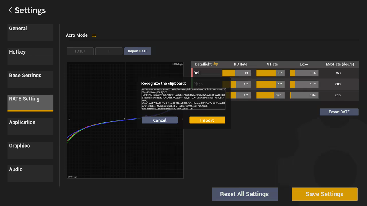Capture your ideal aircraft physics or transmitter rates in a shareable code. One click generates it, a quick paste lets any friend fly with your exact feel.