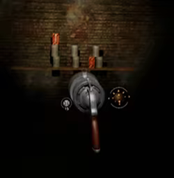 Player knocks down all the cans on the shelves by the specialized gun.