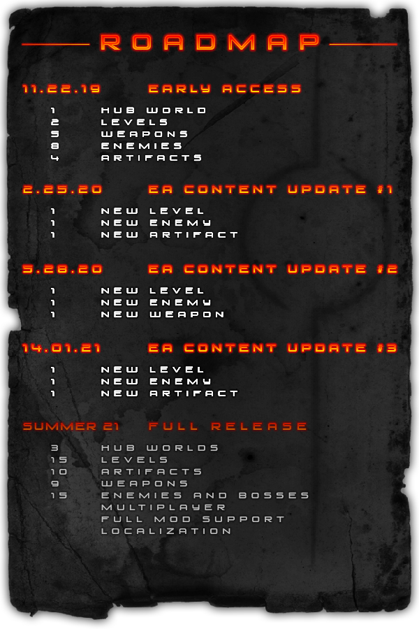 “The current Early Access version of WRATH includes the first chapter Hub, and 2 unlocked levels, 8 enemies, 5 weapons and 4 artifacts. The remaining levels, enemies, weapons and artifacts in the Early Access version will be unlocked with subsequent content updates. Please see the Early Access roadmap that is published on our Steam store page for further info.”