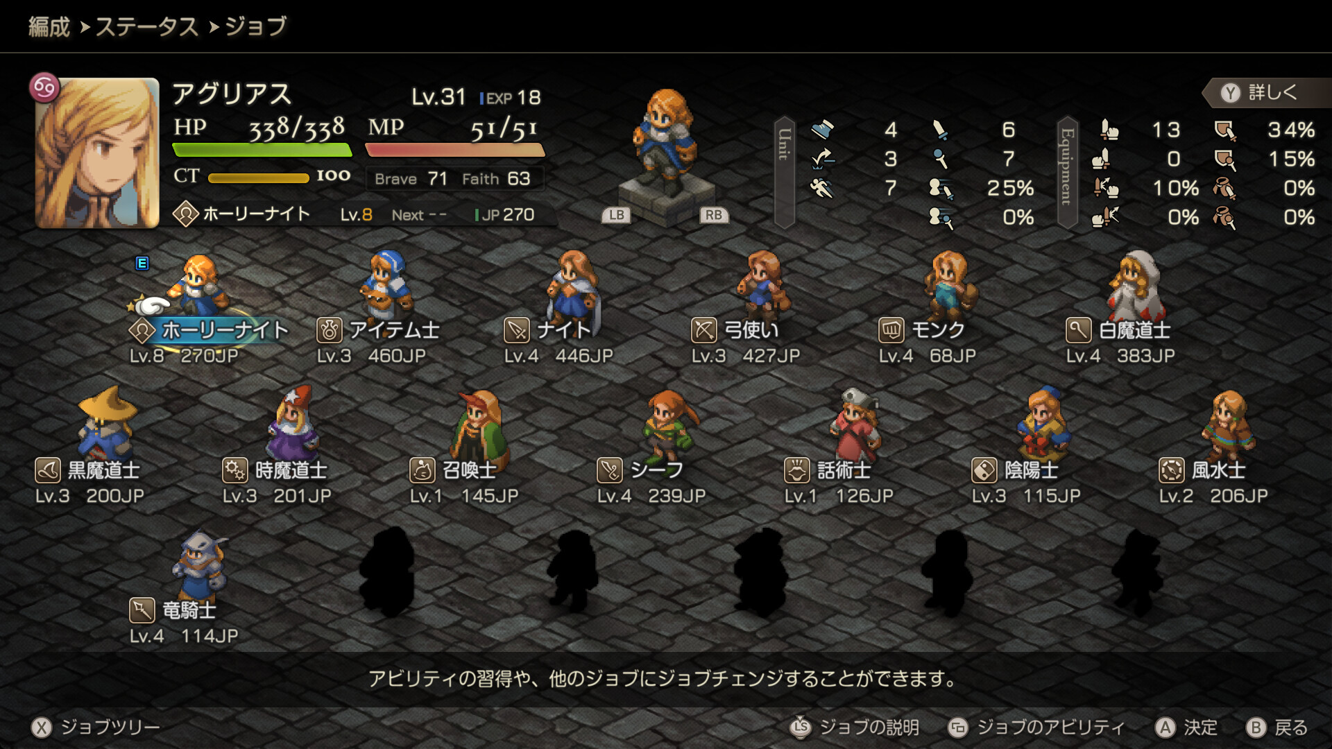 各キャラクターを成長させることで、様々なジョブにチェンジ可能。各ジョブはそれぞれ特徴的なアビリティを習得でき、習得したアビリティは他のジョブでも設定できる。ジョブと数百種類のアビリティの組み合わせを工夫し、貴方なりの戦術を生み出そう。