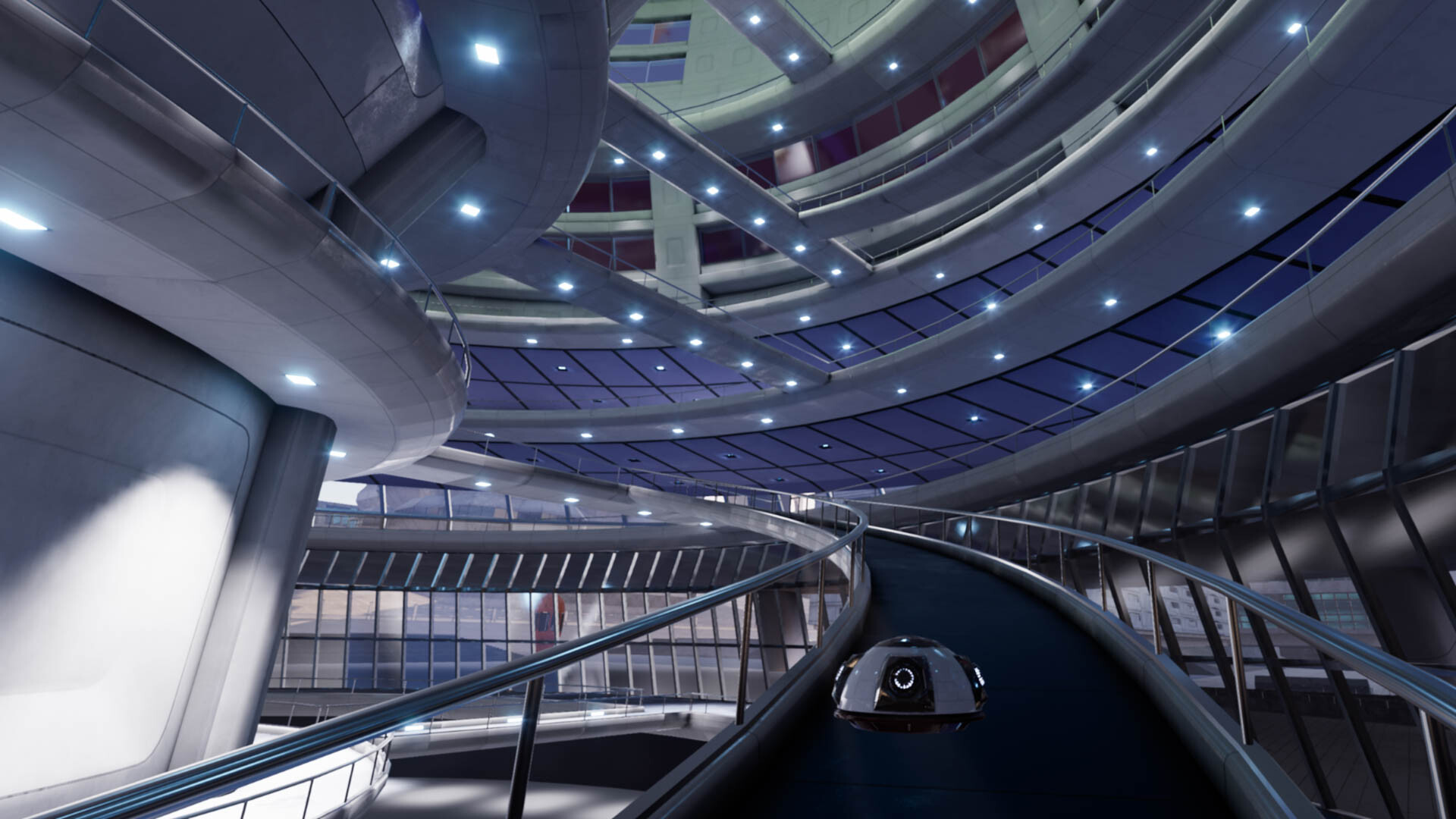 “The player can interact using buttons to call lifts and to open doors and is free to wander around the environment, which is a virtual space approximately a square mile in size without the interruption of level loads. There is also a public transport system allowing the player to take flying shuttle buses between seven locations on the map, including a building on a mountain outside the settlement, using two different lines.
