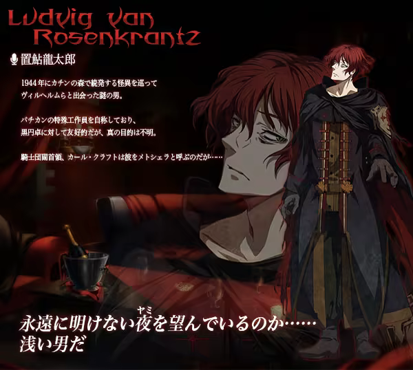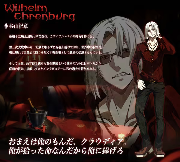 本作『Dies irae ~Interview with Kaziklu Bey~』は作中でも高い人気を誇る聖槍十三騎士団黒円卓第四位・ヴィルヘルム・エーレンブルグにスポットを当てた外伝作品となります。