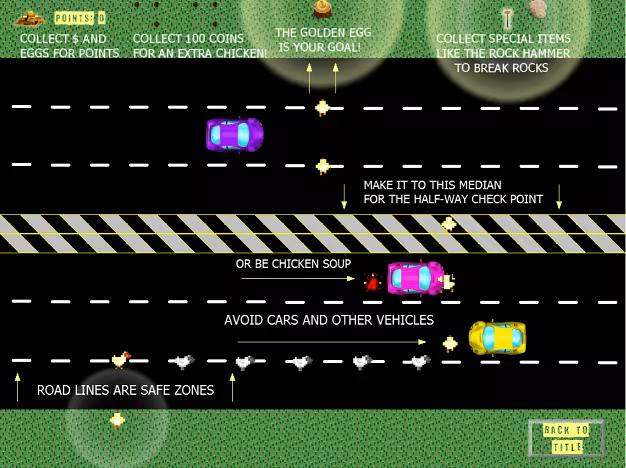- Navigate hazards and traffic to reach the golden eggs on each level