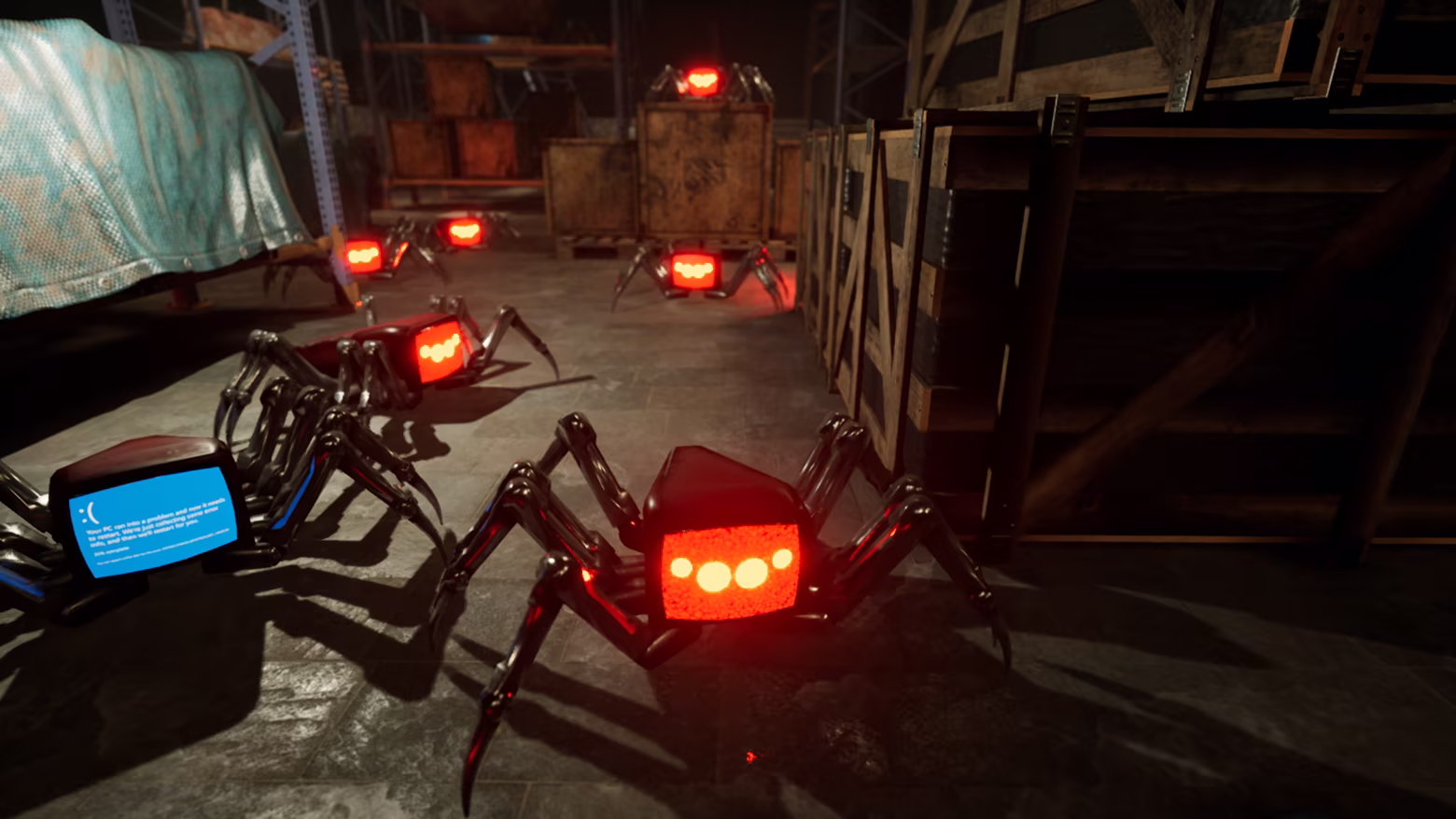 Distorted space and lighting enhance the feeling of anxiety and disorientation.