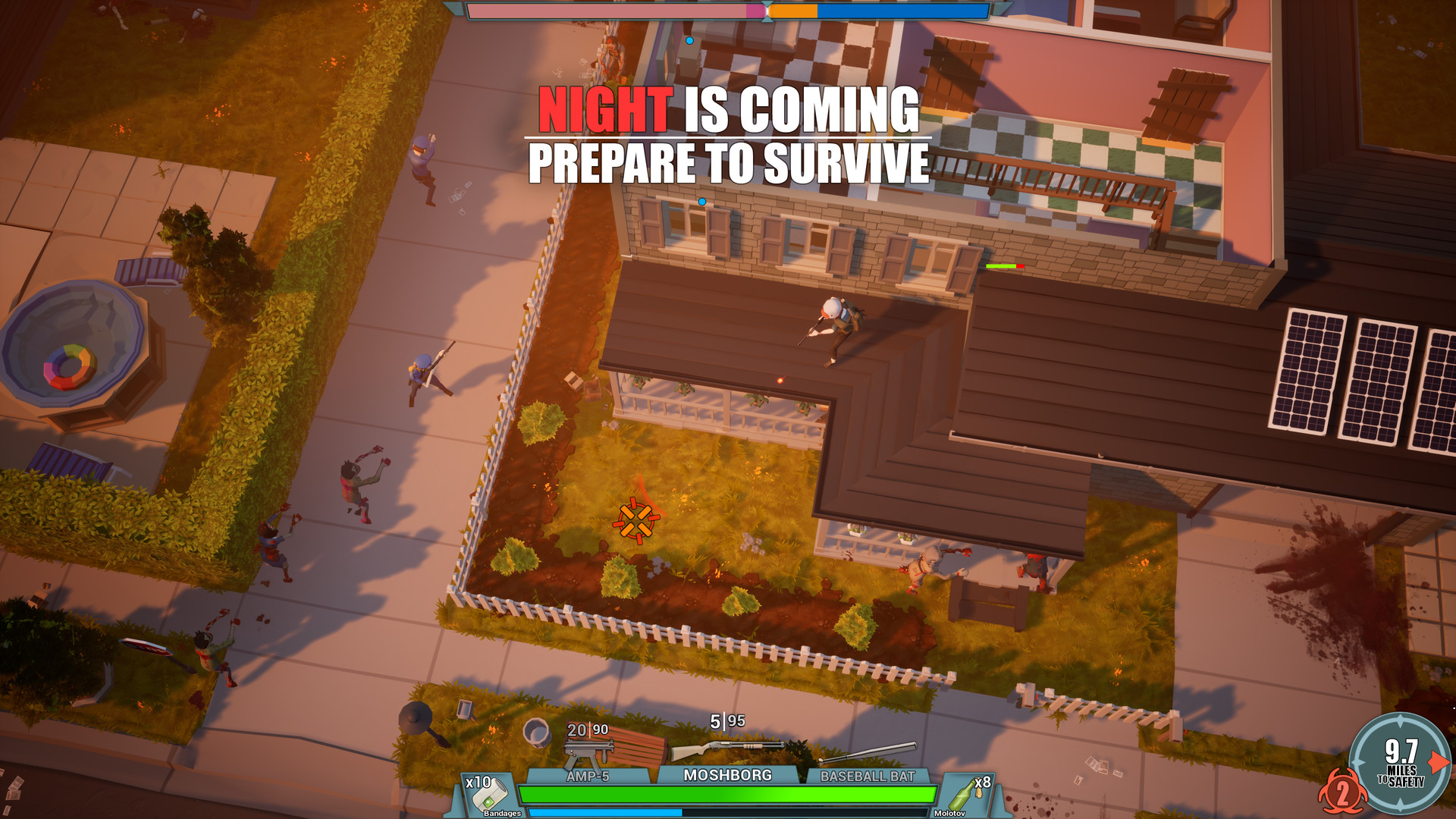 10 Miles to Safety is a unique isometric action/strategy game where 1-4 players must explore, loot, craft and build to survive, all the while trying to make their way through a giant randomly-generated world towards ultimate rescue and escape. As you move nearer your goal you’ll find the infected slowly evolving and becoming more dangerous, but also find more powerful weapons, gear, blueprints and crafting recipes to aid you.