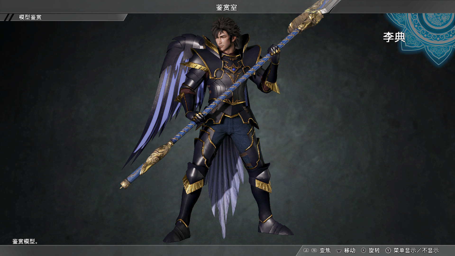 在标题菜单选择【鉴赏室】,从【无双武将一览】中选择李典。请在【变更服装】的【普通服装】中设定服装。