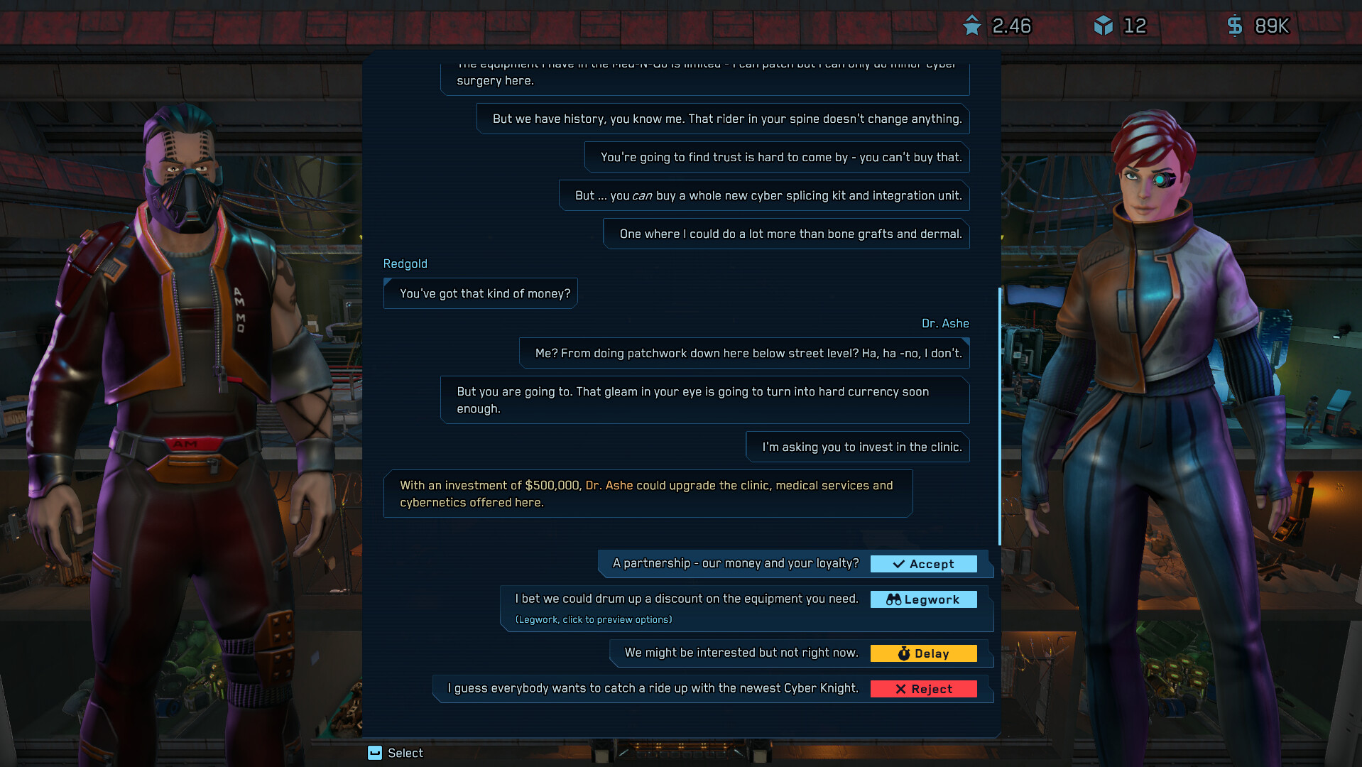 Balance factions, favors, reputation and more. Rivals, fixers, arms dealers and corporate big shots... who you work for, who you fail or betray, all of it can open and close opportunities for you. Watch your heat, and try to make sure more people owe you than the other way around.
