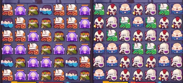 有心的玩家或许会注意到,现在游戏内每个队伍四个站位只会有四种颜色。这个解决方案中,我们为每个种类的棋子都画了ABCD四个颜色,以便玩家最后不管从40多个兵种里挑选出哪4个,都会落在ABCD四个颜色上,从而使棋盘保持较高的可识别度。