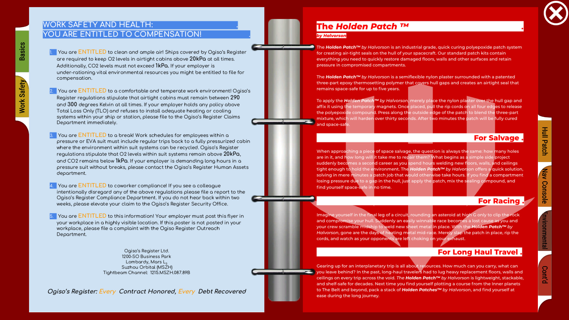 “I cannot change the laws of physics, Captain!” In Ostranauts you will be piloting a ship under the laws of Newtonian flight, learning to fly using in-world manuals and sheets. It will be your job to manipulate control panels, flip switches, and to resist the urge to press the big shiny red button… Every craft has a different flight feel based on thrusters, hull mass, and how you’ve customised the ship. Remember to use a light touch whilst docking, and try not find yourself in the outer rim with an empty fuel gauge.