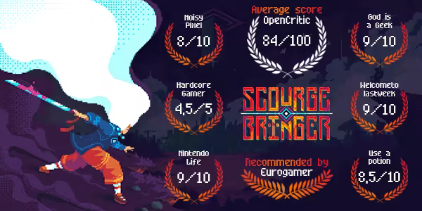 ScourgeBringer is a fast-paced free-moving roguelite platformer. Help Kyhra to explore the unknown and slash her way through ancient machines guarding the seal of her past, and maybe the redemption of humanity.