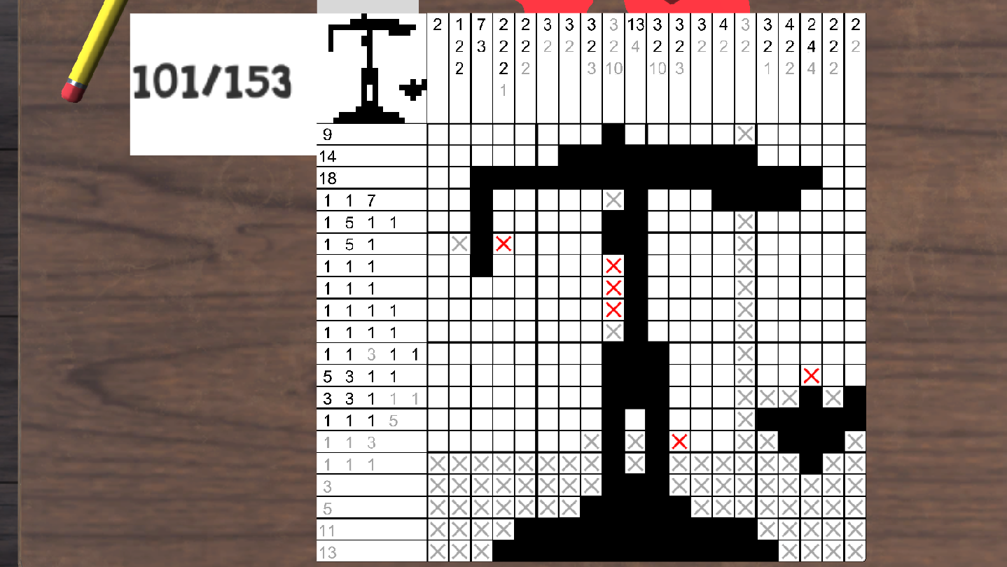 Picross Floof comes with automated error checking to avoid getting stuck on levels, but also to add difficulty whilst encouraging the player to think before filling in a tile. The bigger puzzles have more tries before having to start over, try-count is per composite sub level and not for a whole composite level.