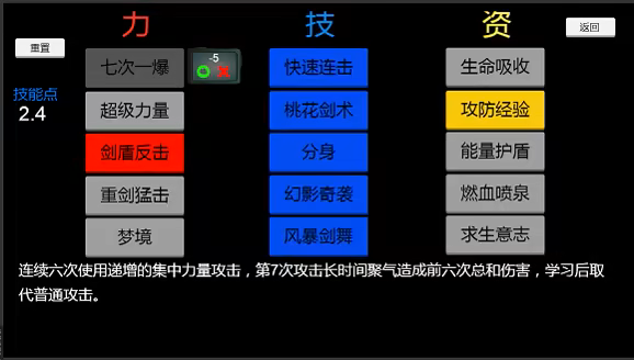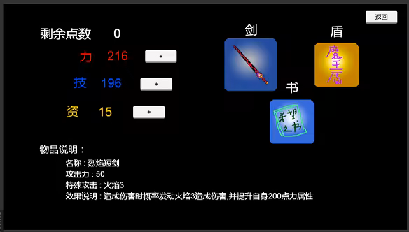 游戏里有力,技,资三种属性。15个技能。剑,盾,书三种装备各30个。每次战斗后都可以从装备,属性点,技能点3种奖励中选择一种获得,合理的选择,使用,搭配装备,属性,技能使自己足够强大以打败更强的对手。