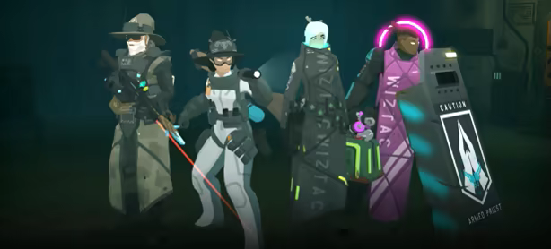 Before we settled on the demo we eventually released, we tried an overly ambitious concept: after defeating the Traffic Warlock in the campaign, Jen and Zan would start glitching forwards in time, glimpsing future content. It culminates in a level where they get to decide both how much of their future they want to see, and also the difficulty of the encounter, by choosing when to seal doors that are spawning enemies and allies from deeper into the game. All while those characters announce their arrival by making meta commentaries on their role in the story or game design.
