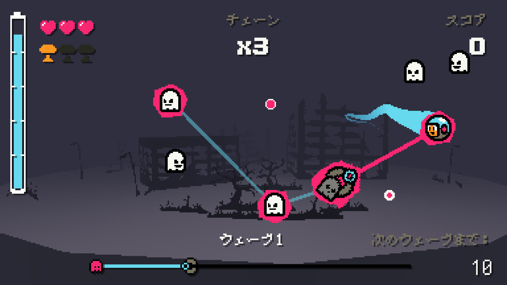 ひっかけビームをご紹介させていただきます!この無限の弾幕アーケードアポカリプスのゲームで、幽霊をひっかけて、何匹を一緒に「チェーン」して、チェーンを破れて、幽霊を一気に倒し、ポイントを取りましょう!