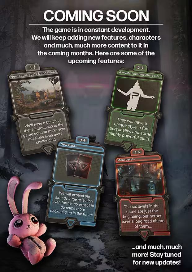Minden egyes hőst (és ellenséget) egy pakli kártyával tudsz irányítani, ezek segítségével tudnak többek között támadni, mozogni, védekezni. Csapj le az ellenséges robotok, robot kutyák és drónok seregeire olyan egyedi fegyverekkel, mint a plüssnyuszi bomba!