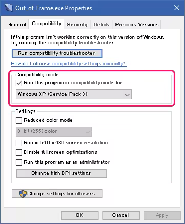 Right-click on Out_of_Frame.exe and select Properties from the menu.