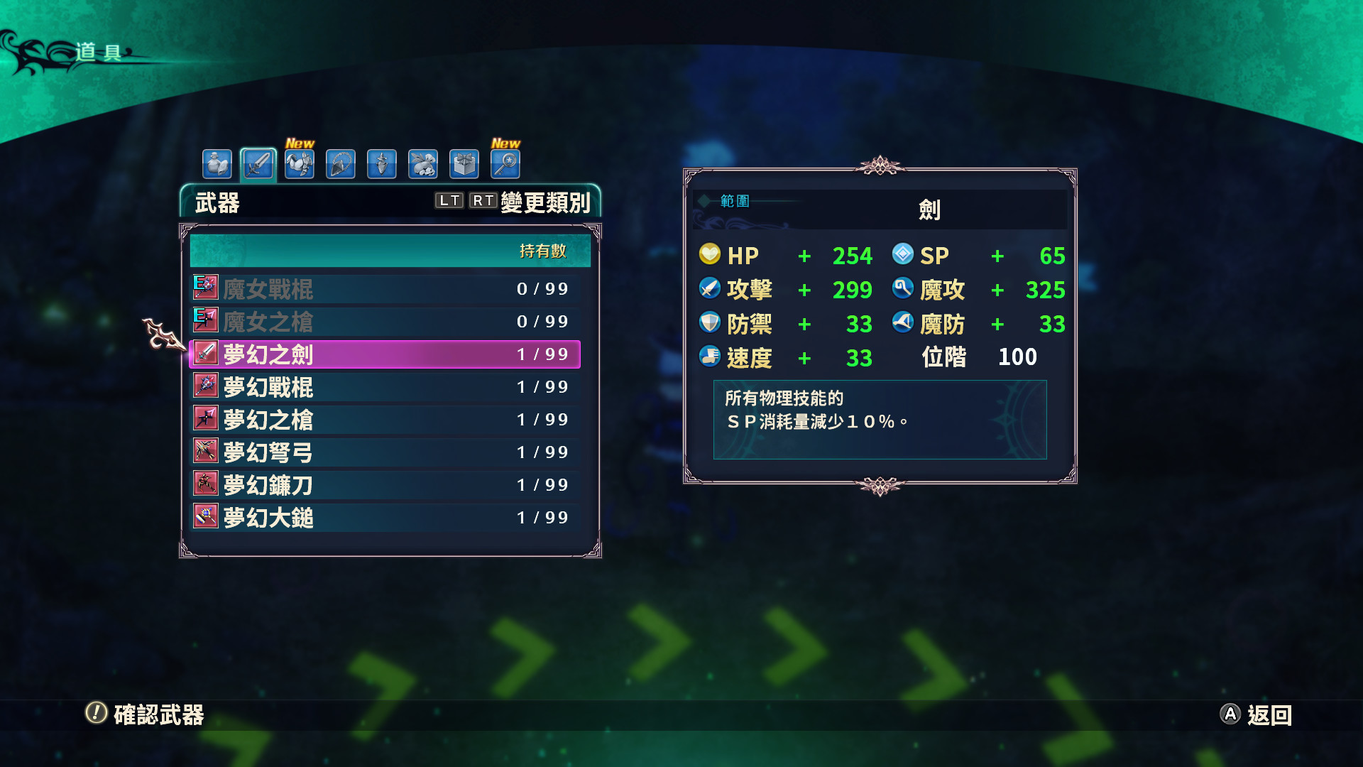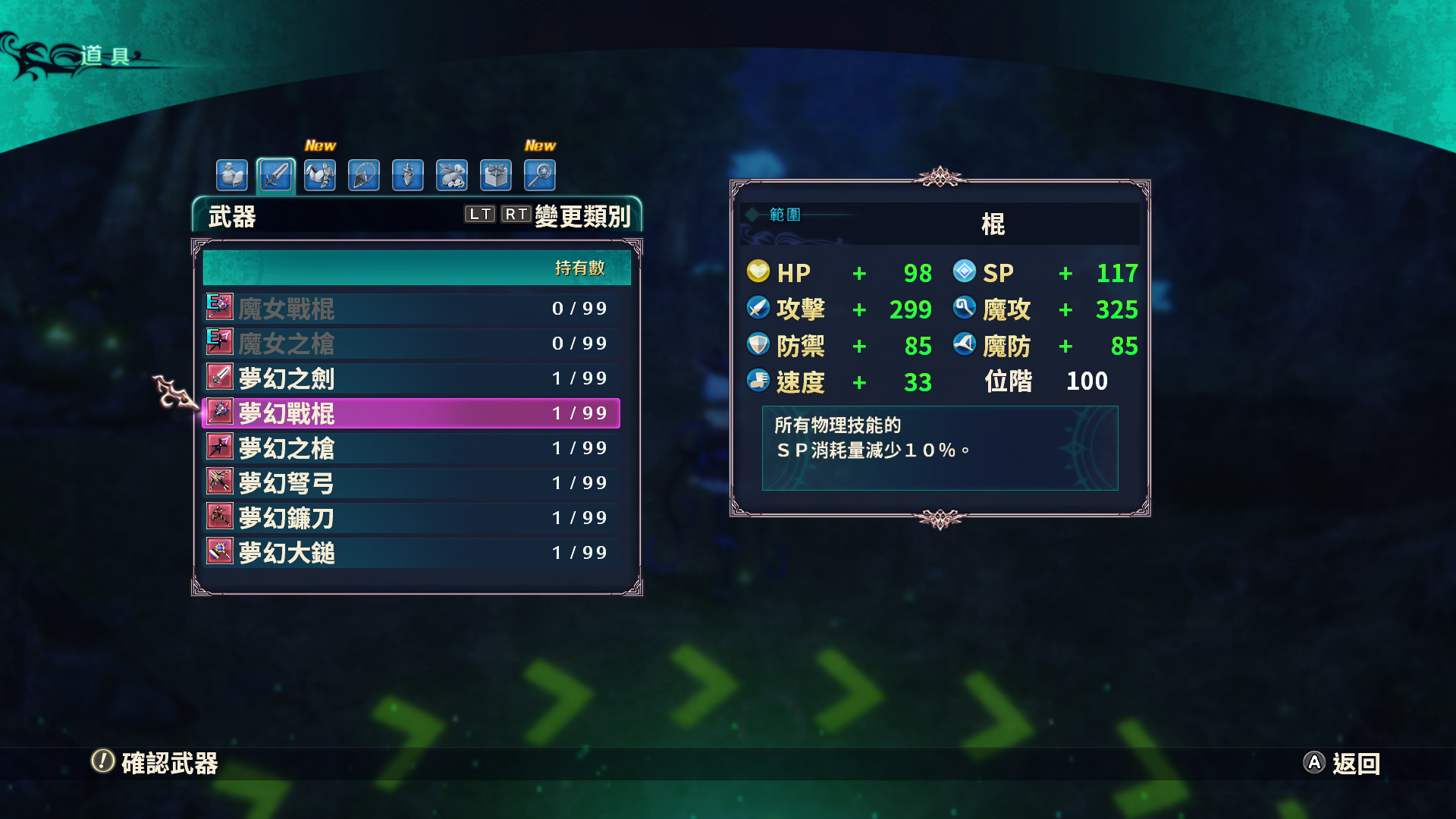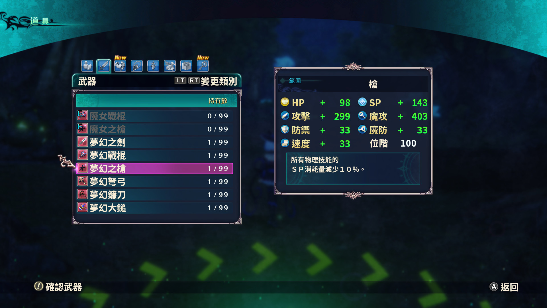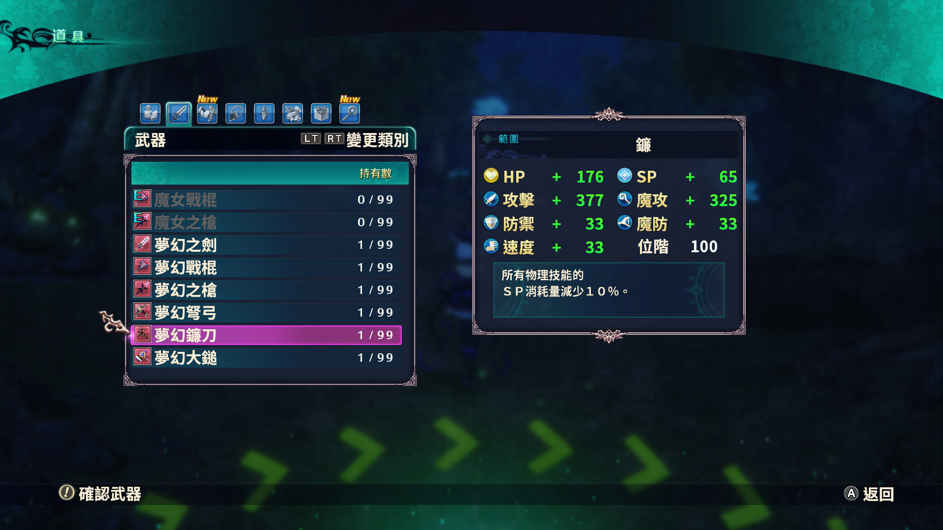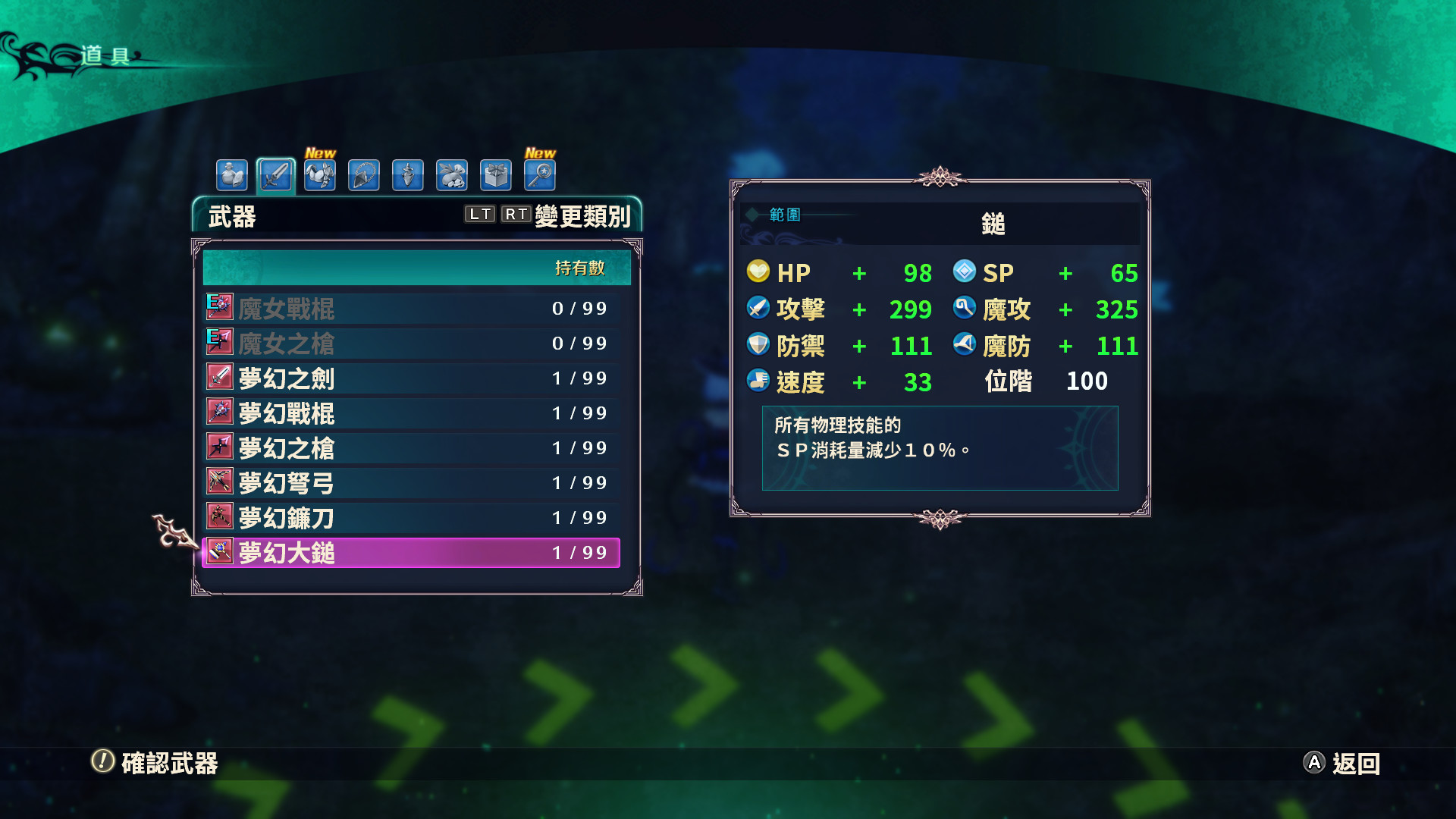 夢幻之劍、夢幻戰棍、夢幻之槍、夢幻弩弓、夢幻鐮刀、夢幻大鎚