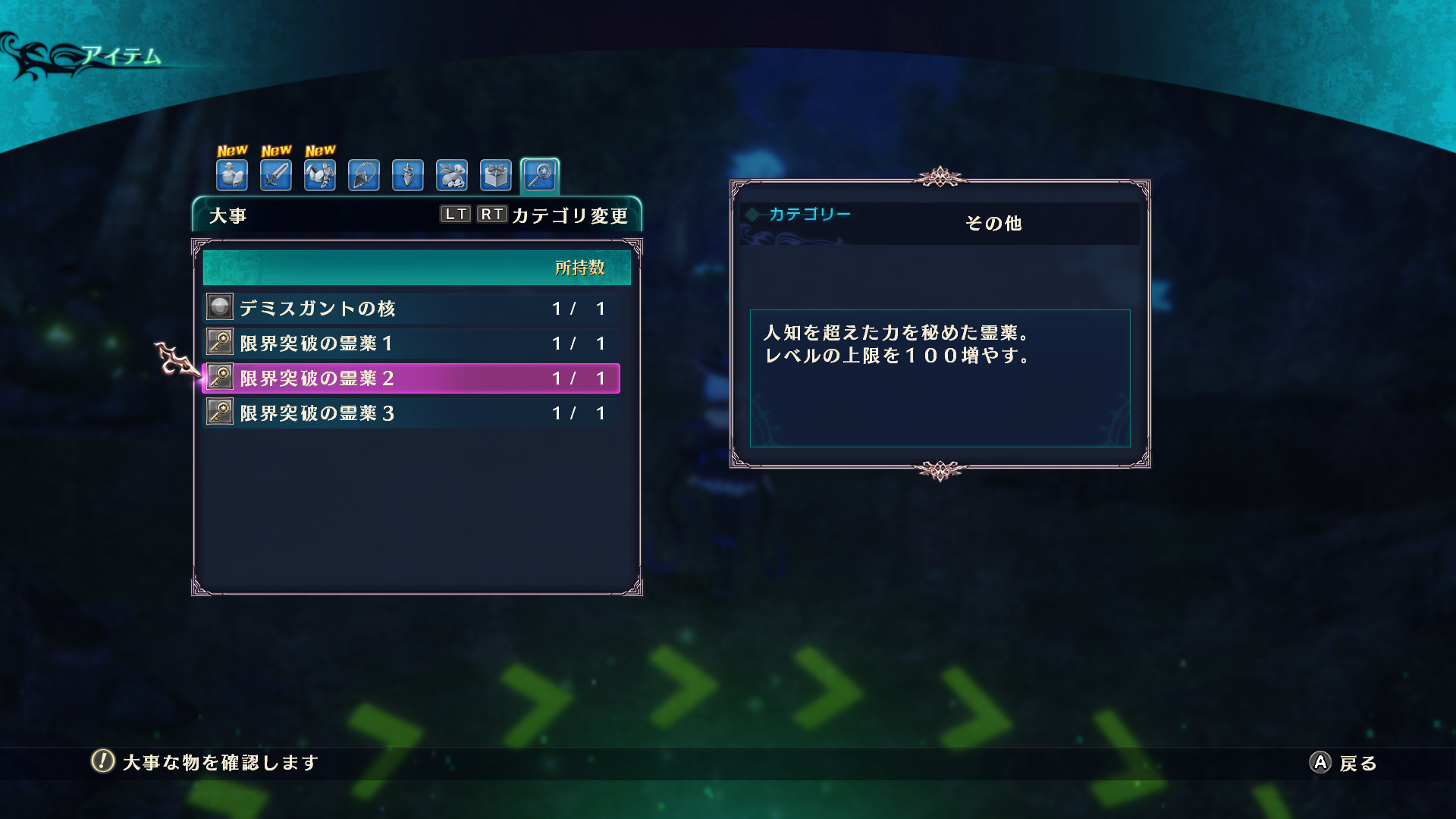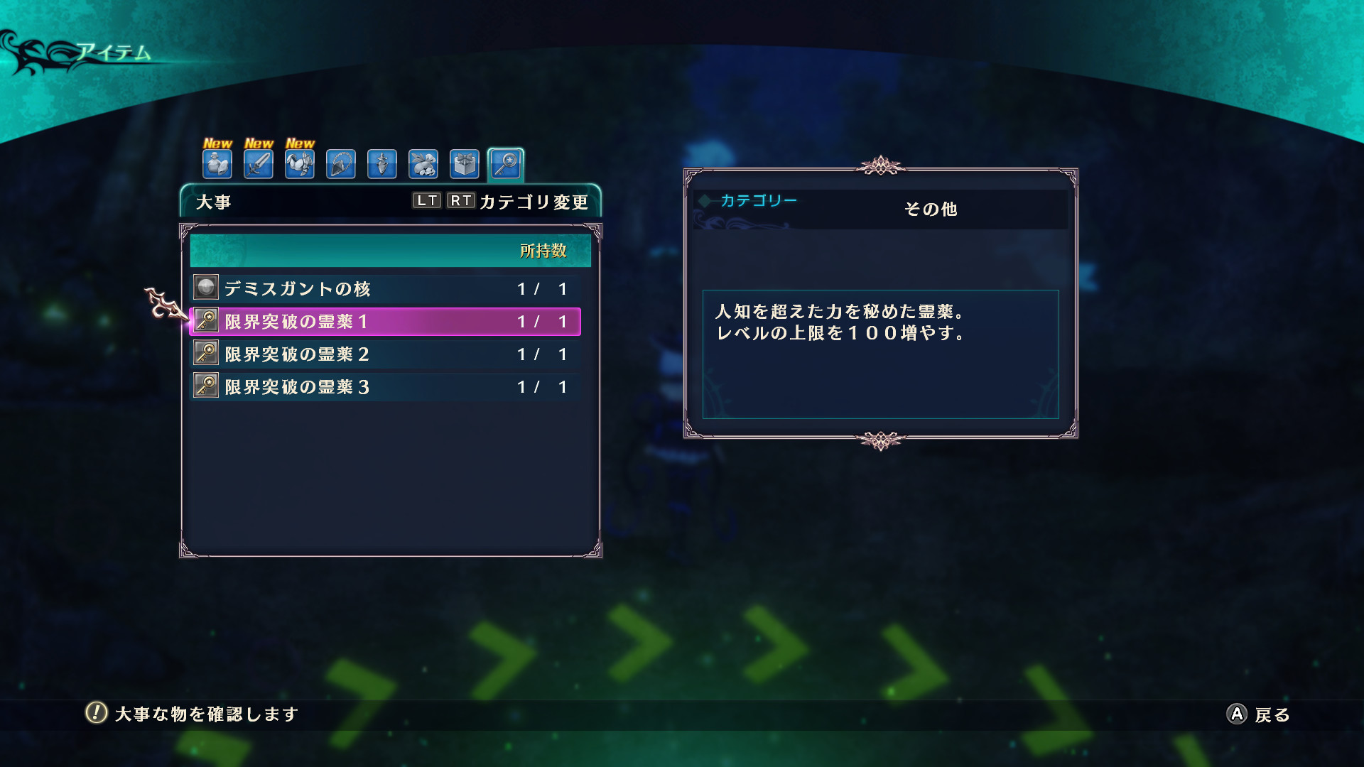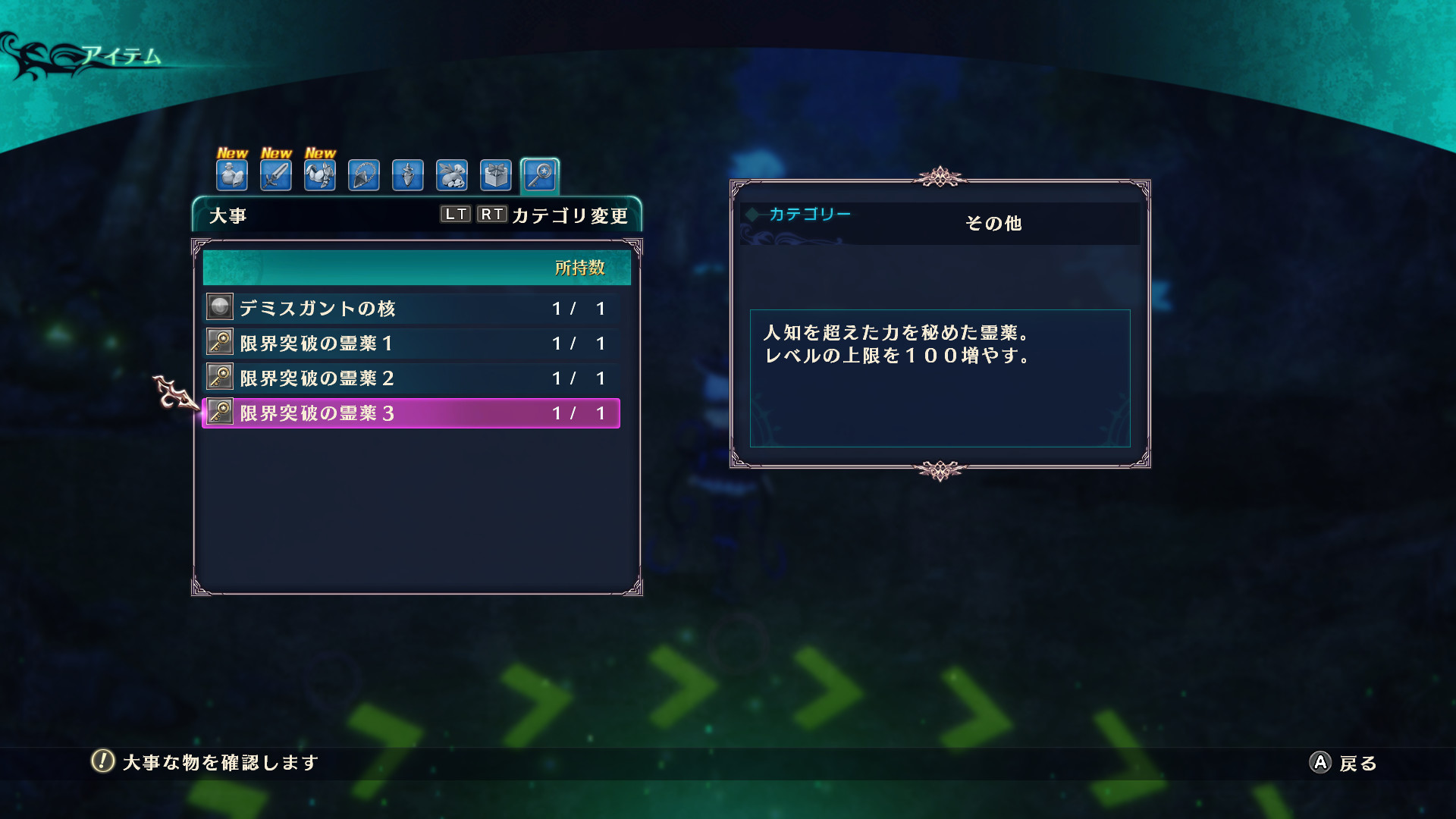 パーティメンバー全員の最大レベルを100アップするアイテムの3種セットです。(合計で300アップします)