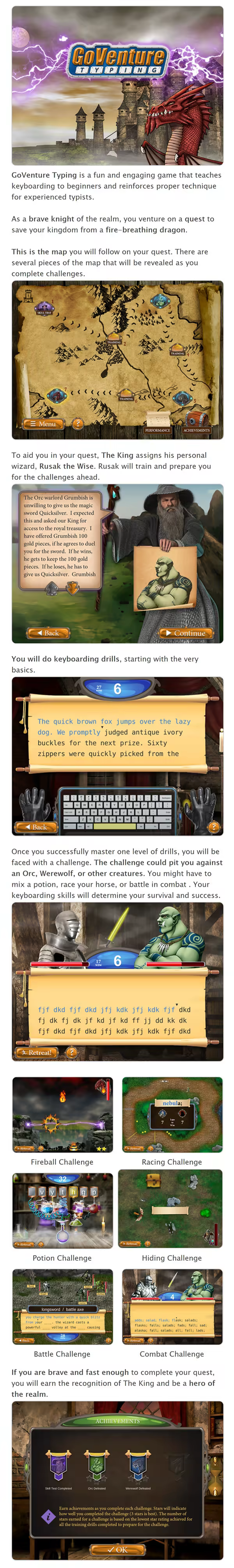 Learn how to type or type faster with this fantasy-science-fiction game. As a brave knight of the realm, you venture on a quest to save your kingdom from a fire-breathing dragon. Role-playing game with 48 levels and 500 drills guarantees you will master typing and win at school, work, and gaming! All ages.
