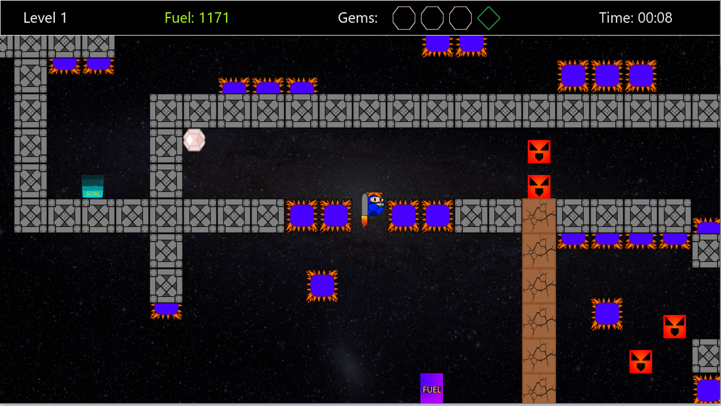 Jetlad flies around using his jetpack. His jetpack will explode when it runs out of fuel. Be sure to collect all the Fuel jugs you come across.