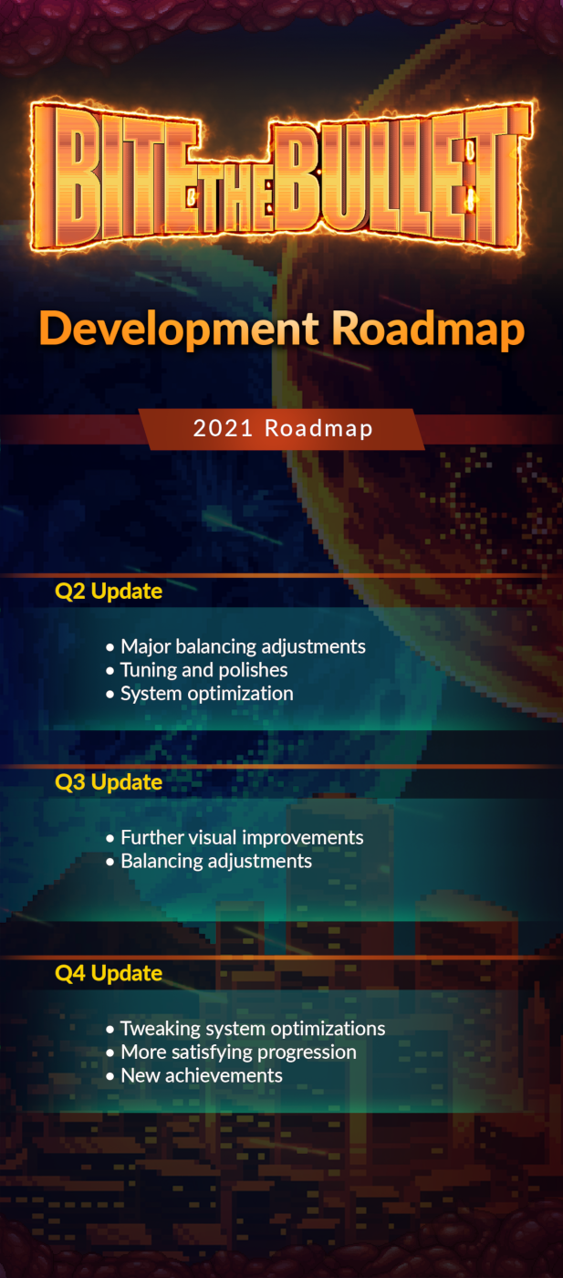 Bite The Bullet is the world’s first Run & Gun & Eat. In this roguelite RPG shooter you must eat enemies, bullets and more to powerup your character, weapons, and abilities. Gun down zombies, robots and giant mutant bosses with a barrage of bullets before chowing down on their corpses to craft new weapons, unlock new abilities and special attacks, and transform into a powerful Zombro form to smash foes. Explore four character classes and a skill tree based on your diet – and remember, you are what you eat!
