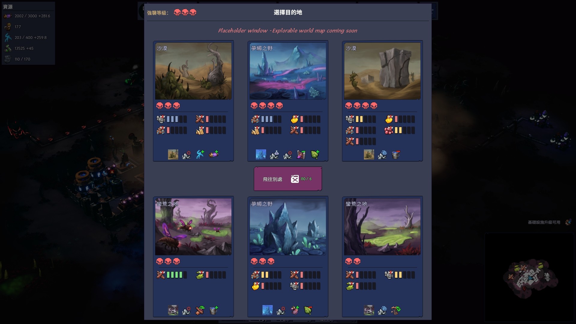 資源是稀缺的,而您需要大量的資源來將您的城市變成一個自給自足的帝國。好在當您耗盡了周圍的一切資源時,您隨時可以移動到另一個地方。每一個生物群落都有一處由系統生成的無限多樣的著陸區,每一處都有不同的資源、機會和挑戰