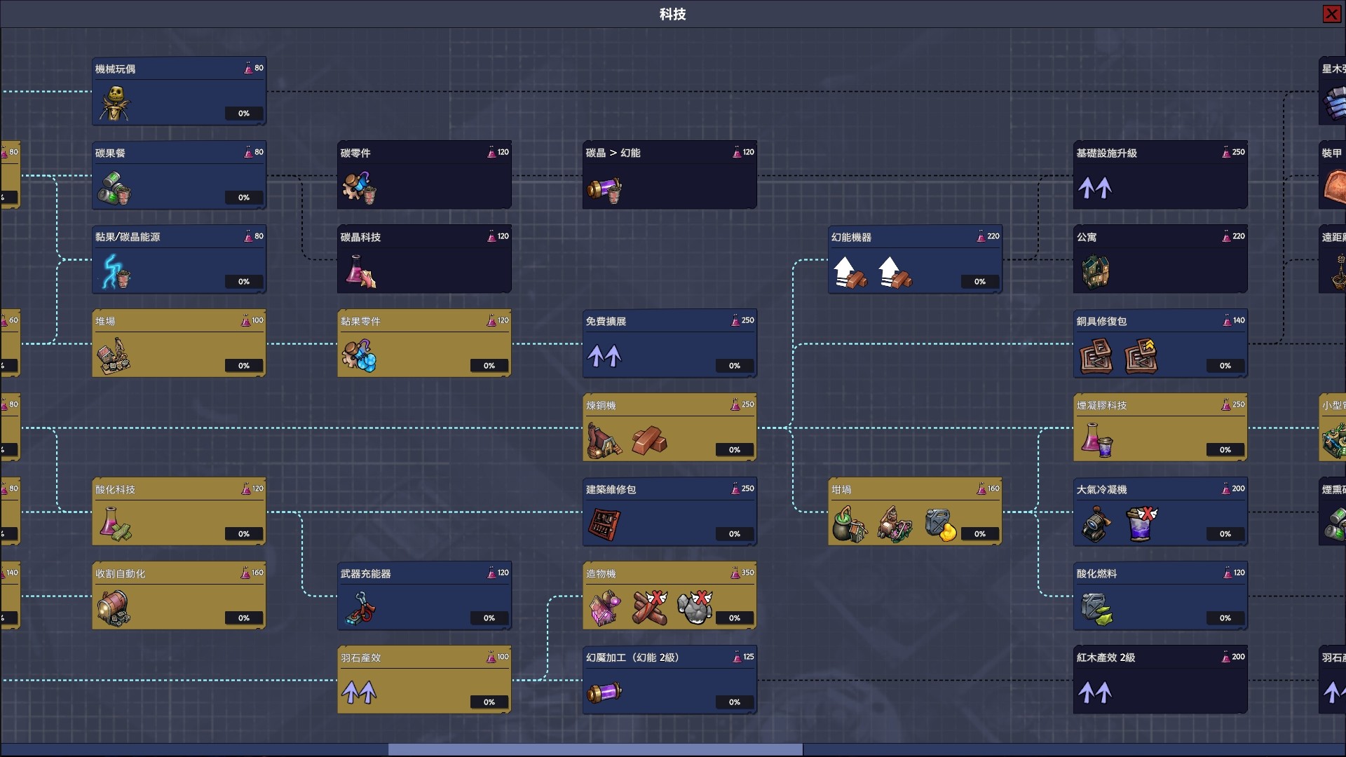 古人使用了先進的夢幻科技,但其中大部分現在已經被幻魘群襲和時間沖刷掉了。您可以在飛行城市中建立先進的科研設施研製其中一部分科技,為您的蒸汽機器人解鎖高級建築和新的工藝配方