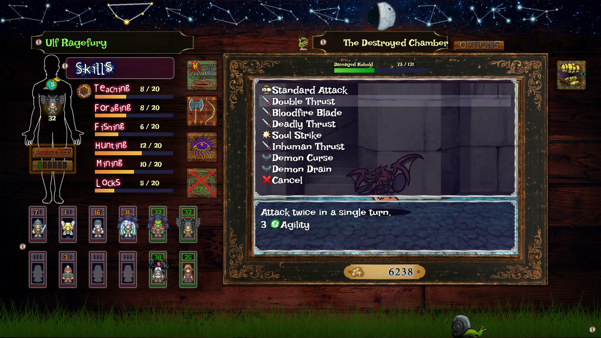 • Six crafting skills, six abilities, many health and magic statistics.