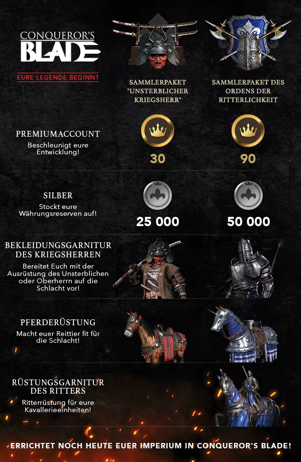 Holt euch noch heute das Sammlerpaket "Unsterblicher Kriegsherr" und beginnt eure Heldenlegende in Conqueror's Blade!