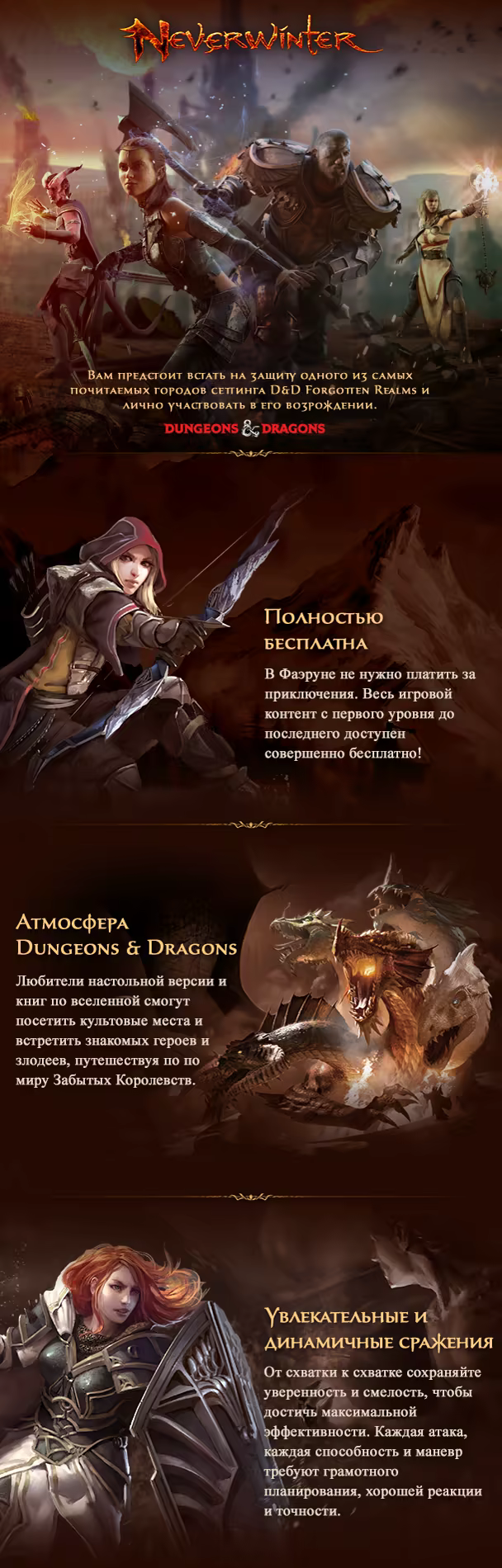 Neverwinter – бесплатная MMORPG с активной боевой системой по вселенной Dungeon & Dragons. Эпический сюжет, яростные битвы и классическая ролевая система ожидают смелых героев, готовых отправиться в фантастический мир Neverwinter!