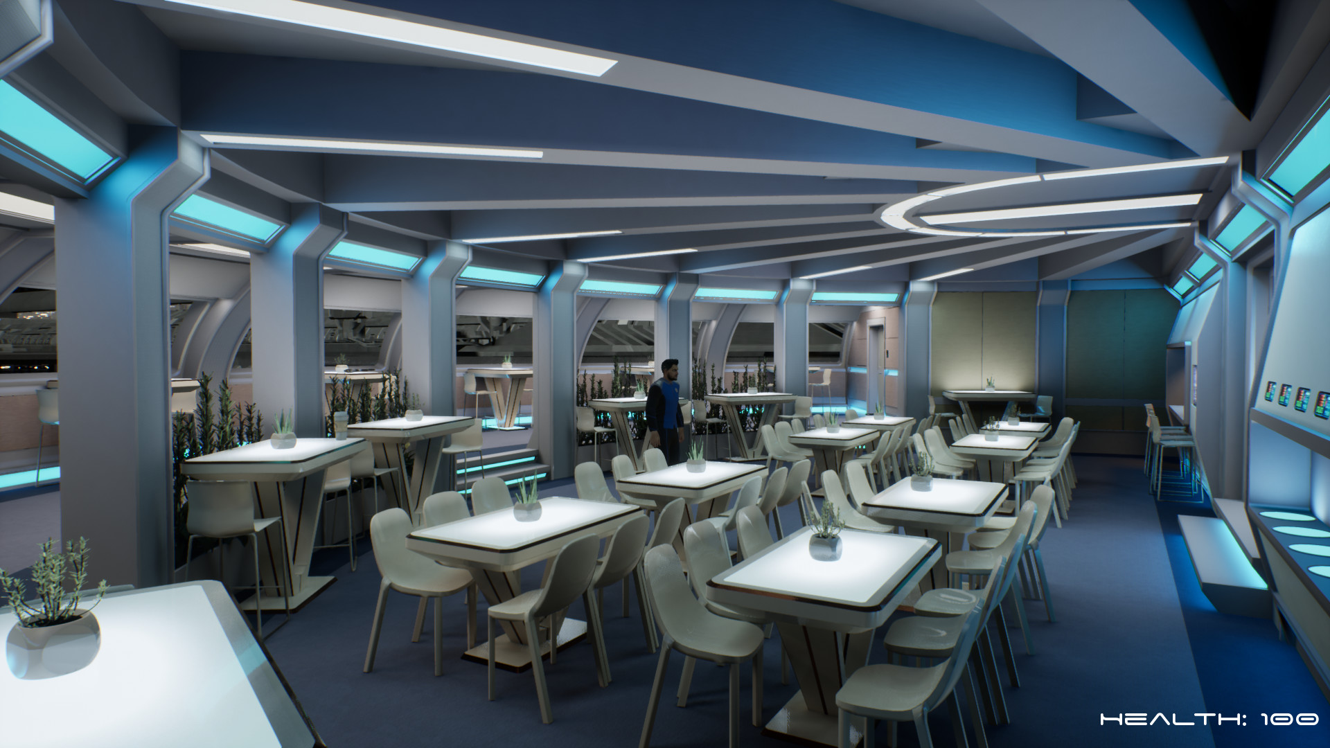 • Take in the breathtaking views out of the Mess Hall windows of the Planetary Union Dockyard in Earth orbit.