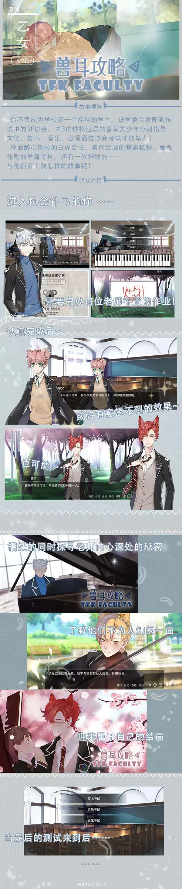 《兽耳攻略》是一款文字类恋爱游戏,多线AVG剧情,不同选项的分支,小测成绩的好坏都会影响你们的关系,为了迎接协会最终的测试,要好好留意老师说过的话哦~