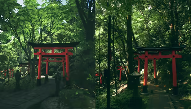 The map is very extensive to explore with shrine gates laid out over the entire mountainside. I've tried to include a lot of variance in different parts of the mountain, with lots of points of interest to discover and many branching/intertwining paths to encourage you to make choices with your exploration. Take photos with the in-game camera, customize the soundtrack, walk around at your own pace. Your attentiveness and eagerness to explore will be rewarded with access to hidden areas, areas that will be easily missed by a rushed player.