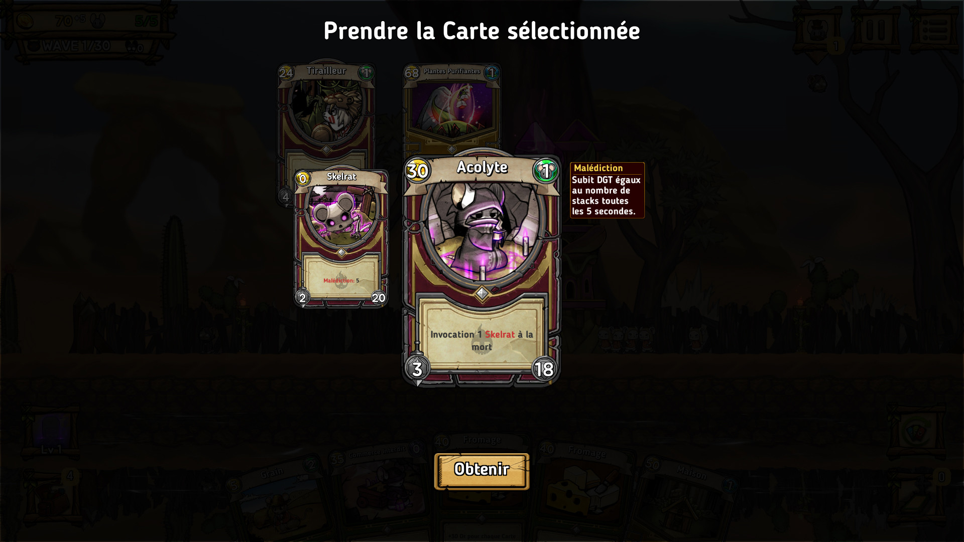 Choisissez parmi plus de 500 cartes de type économie, bâtiment, militaire et pouvoir pour exécuter votre commandement stratégique. Tous les chefs commncent leur voyage avec un deck de 8 cartes de base. Construire un deck efficace est essentiel pour protéger vos rats des vagues d'ennemis assoiffés de rats. Ajoutez, supprimez et améliorez vos cartes pour créer un deck digne d'un vrai leader!