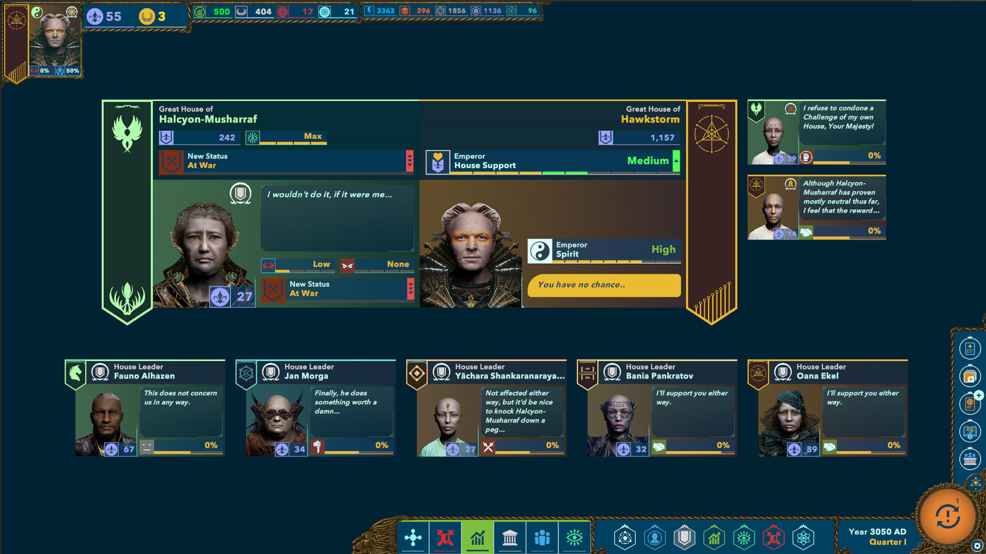 You too are a member of a Great House. Your House and those of the other noble families will each employ a unique playstyle. For example, Houses with a technocratic tradition will research advanced technologies to grow their power, while those with a mercantile culture strengthen their rule through economic growth and trade.