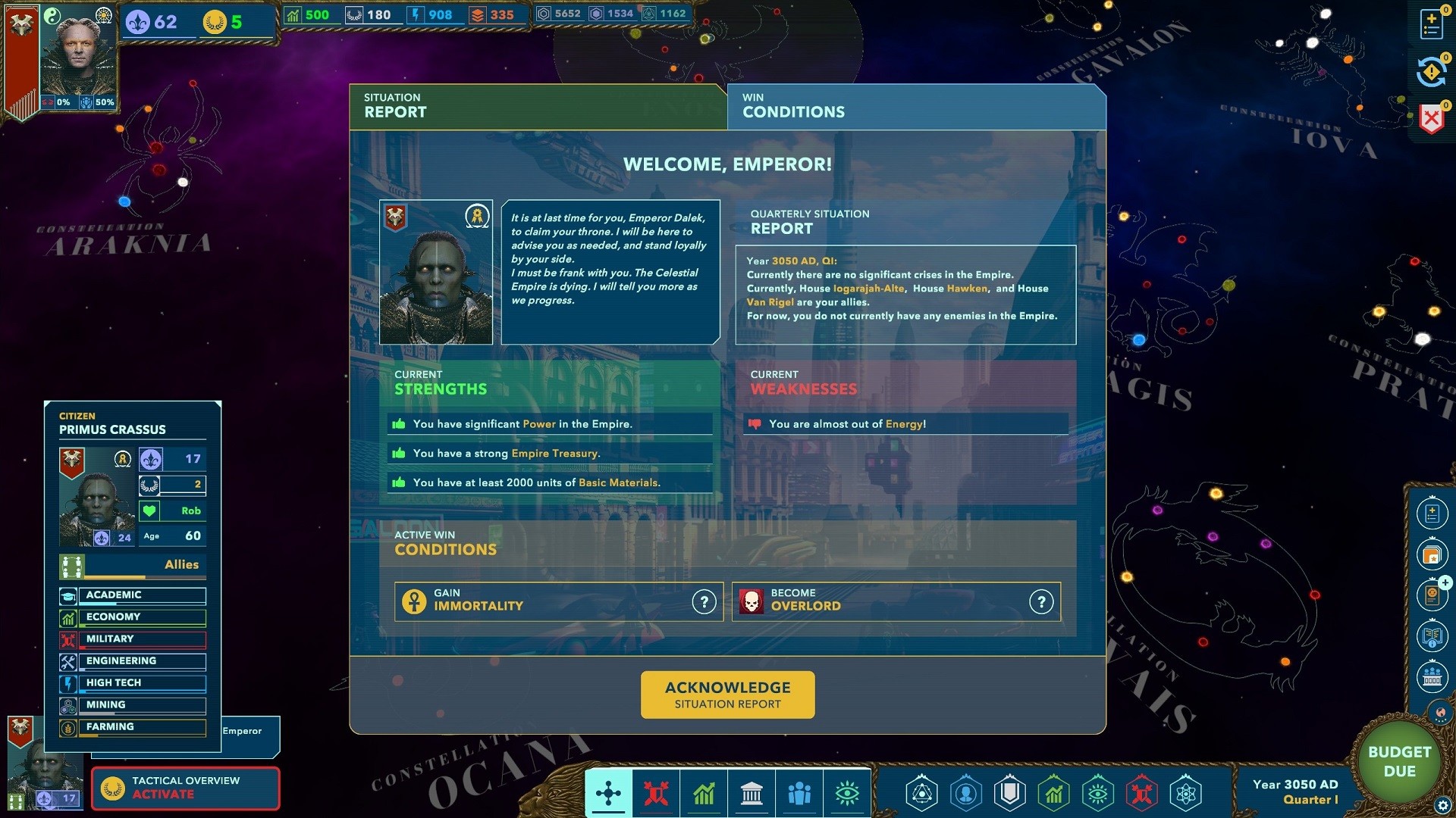 You cannot micromanage the daily affairs of each planet in your empire, and you do not have omnipotent control of the economy or military. Instead you can only wield your authority as a real emperor or empress would, by managing relationships and politics to rule through appointed officials. Some serve as your governors, ruling planets and star systems in your name.