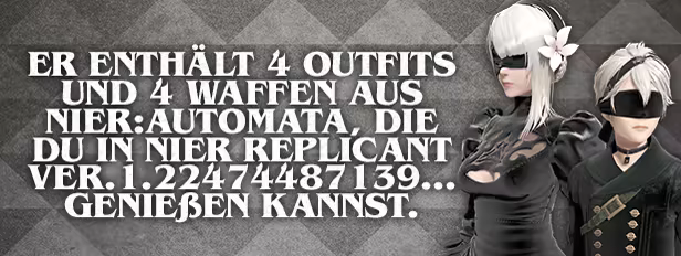 Er enthält 4 Outfits und 4 Waffen aus NieR:Automata, die du in NieR Replicant ver.1.22474487139... genießen kannst.