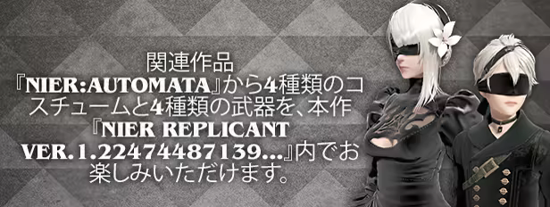 関連作品『NieR:Automata』から4種類のコスチュームと4種類の武器を、本作『NieR Replicant ver.1.22474487139...』内でお楽しみいただけます。
