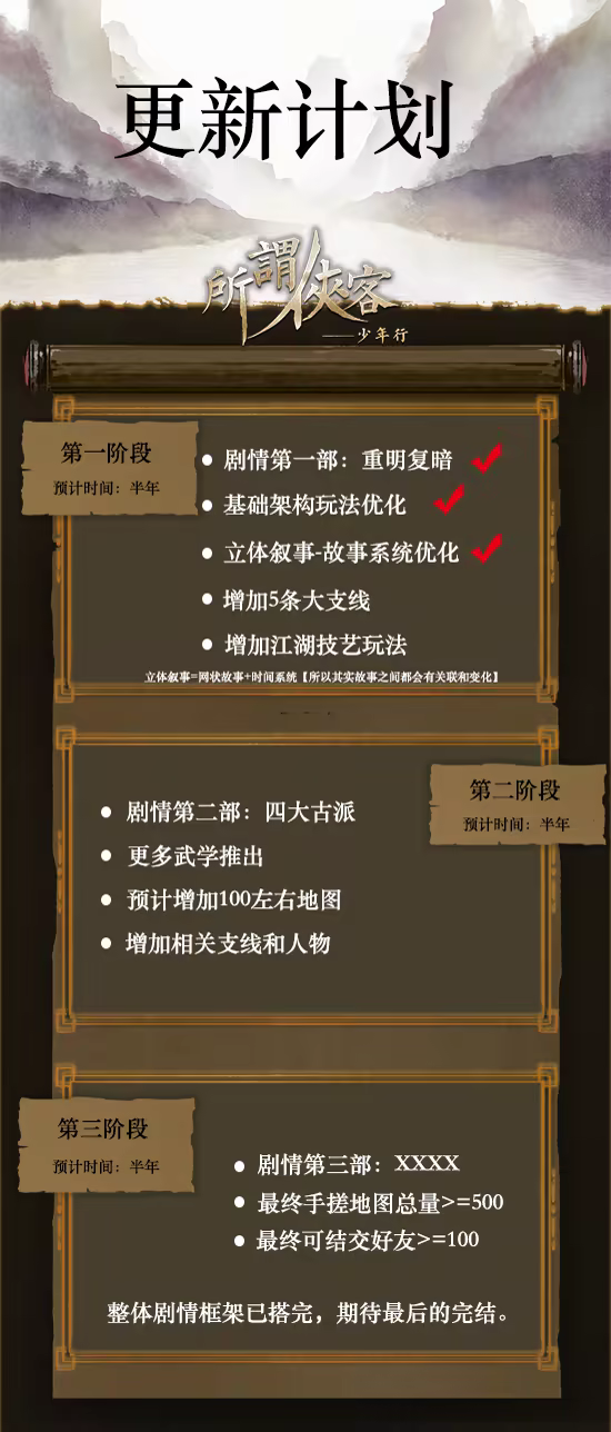 “完整版的话,会慢慢加入门派故事,推进故事线,还有新的人物出现,总之有人的地方就有江湖,而这些人必须是有性格的,有故事的,不是简单一个角色,配上不同的数据。所以在设计上也是特别耗时间。”