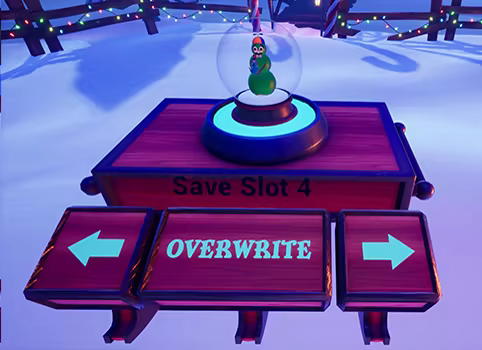 When you're ready to save your creation, the snow-globe generator table will take your well crafted snowman, and shrink it down to fit inside a snow-globe. These snow-globes will save your snowman to a specific slot in your currently selected profile. There are three profiles built into the game, and each profile has 10 slots for saved snowmen for a total of 30. Your saved snowmen will appear on a shelf inside your cabin. You can revisit a previously saved snowman by picking it up off the shelf, and putting it into the portal.
